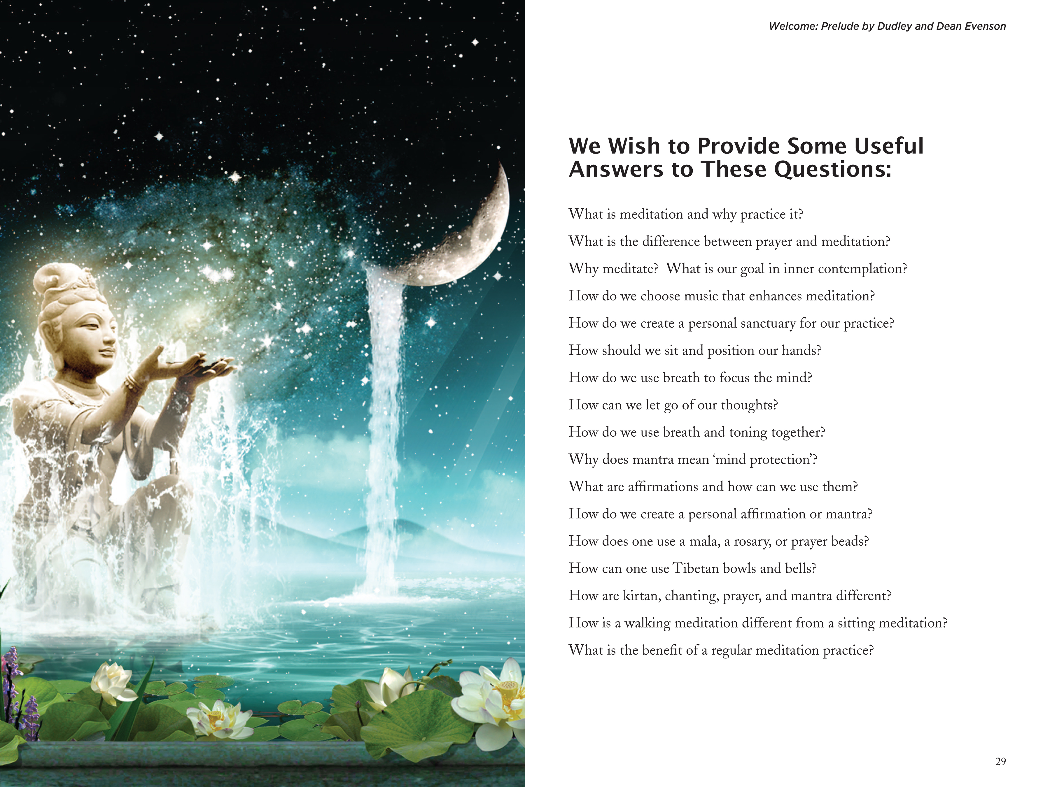 Quieting the Monkey Mind: How to Meditate with Music by respected music pioneers and purveyors of peace Dudley and Dean Evenson helps make meditation understandable, accessible and simple to do. Whether you have been meditating for years, or are just beginning on your path, you will benefit significantly from this beautiful guidebook designed for all ages and practices.