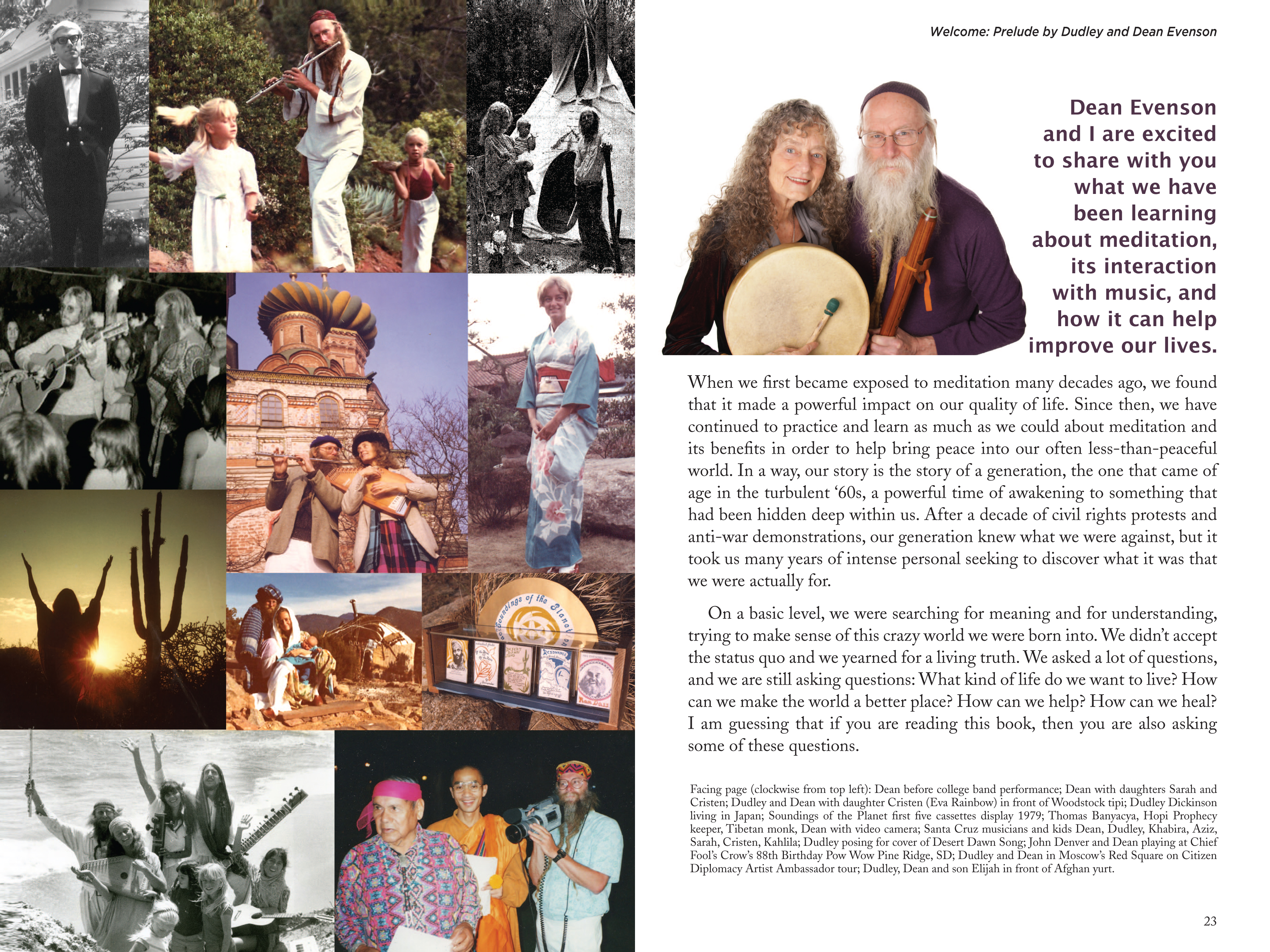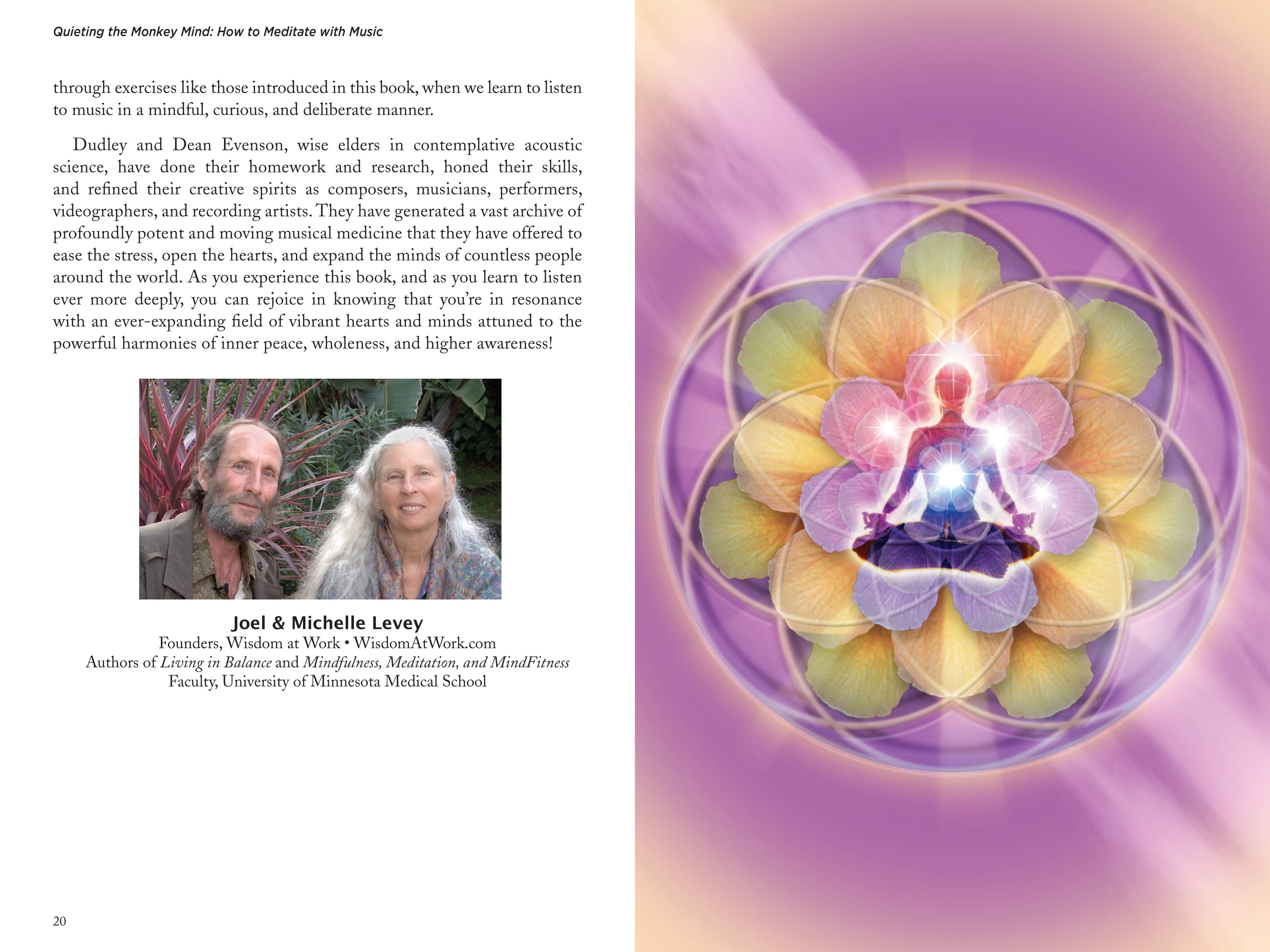 “Quieting The Monkey Mind: How To Meditate with Music.” Written by sound healing and New Age music pioneers Dudley and Dean Evenson of music label Soundings of the Planet. 160 pages color. Design, illustrations/photo-illustrations and layout by Bob Paltrow. Seated figure with chakras illustration on book cover by Elijah Evenson, from the Soundings of the Planet album Chakra Healing.