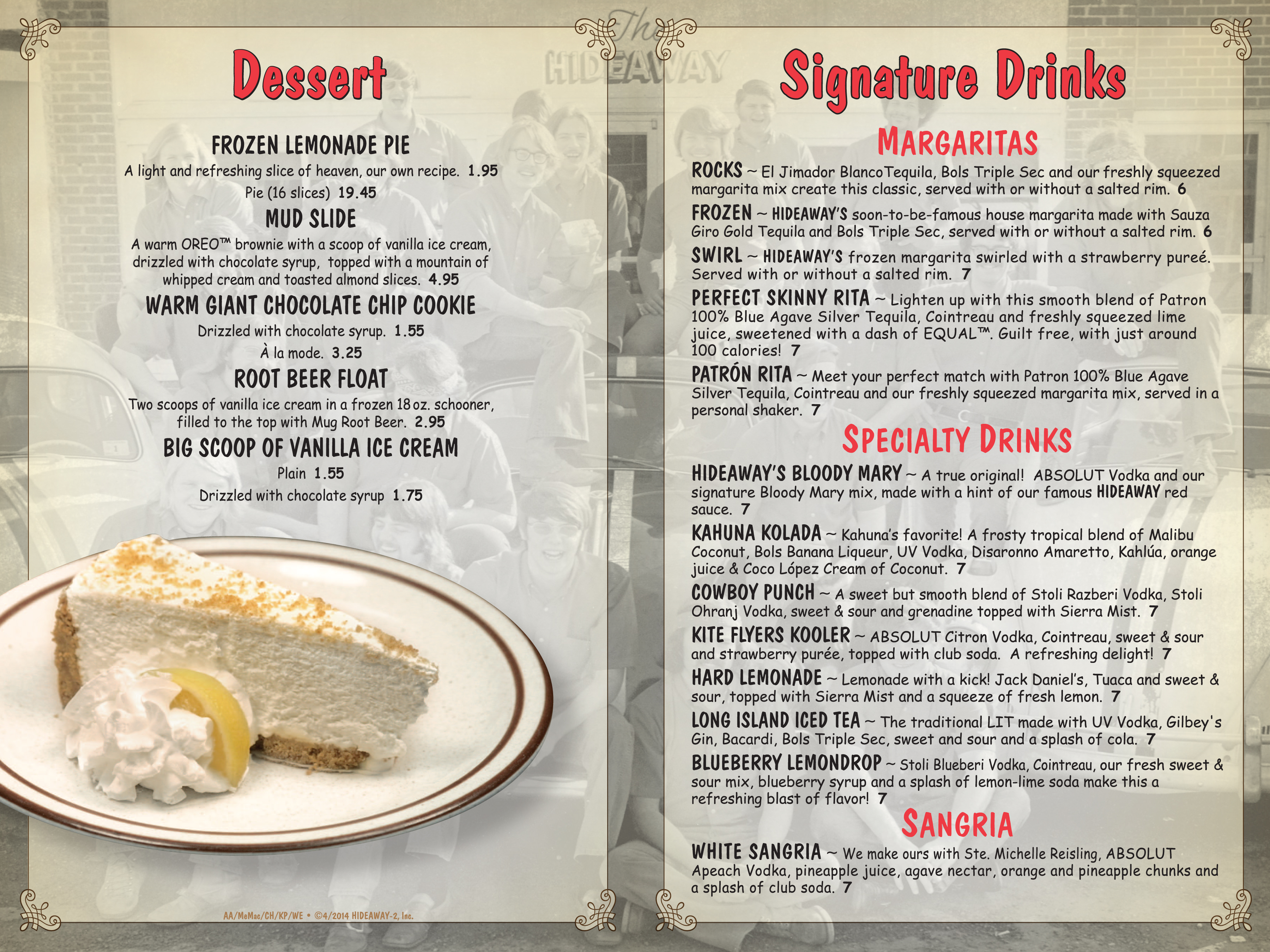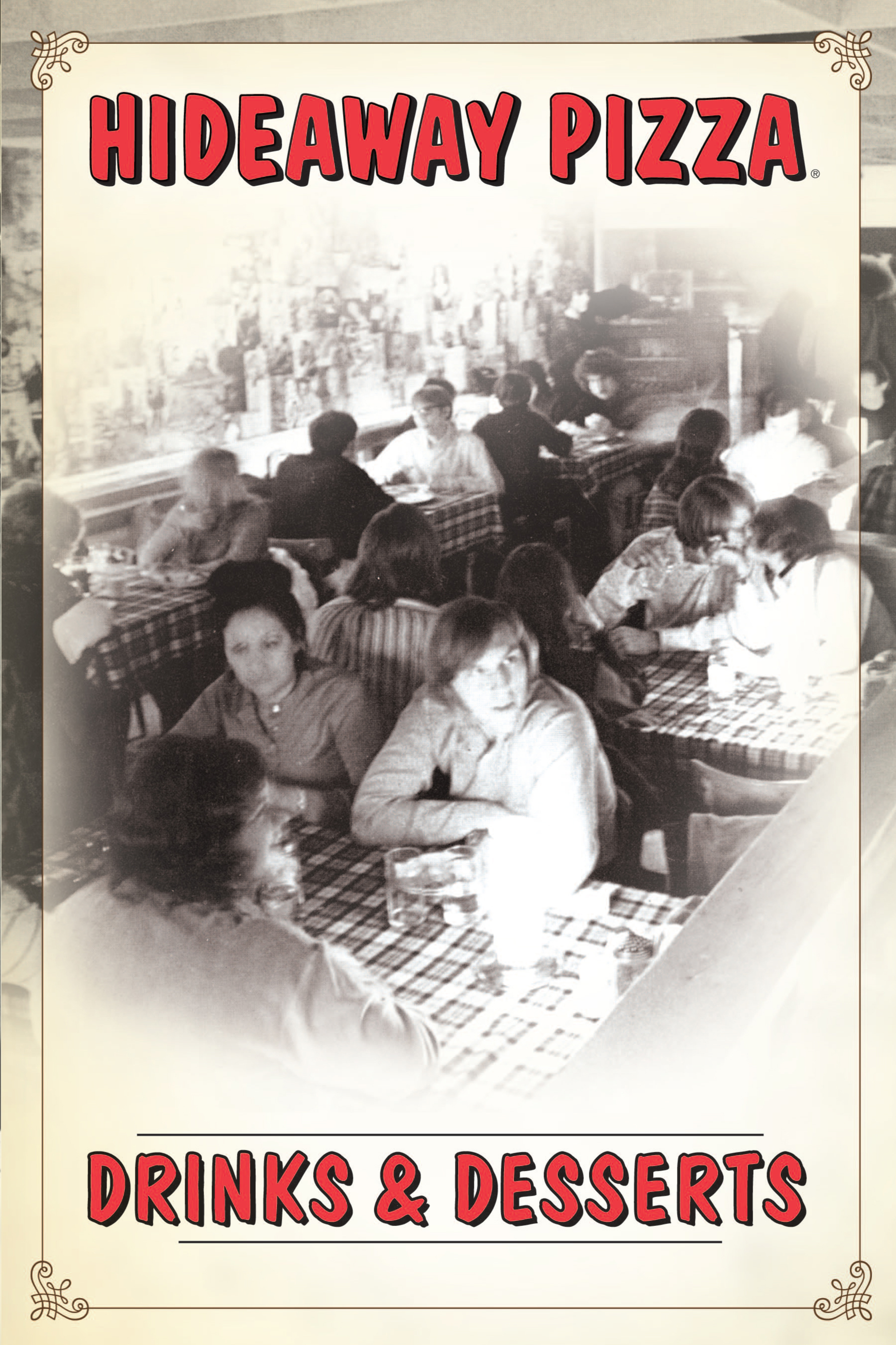 Hideaway Pizza, with 15 restaurants (as of 7/2014) in Oklahoma, has been in business since 1957, and touts its longevity with a branding scheme that puts emphasis on creating a retro look, employing many photos from the company’s archive of photos from the late 50’s, ’60’s, ’70’s, ’80’s and continuing into the new millennium. One of our key images is what we call “The Kissing Couple”; if you look at the cover on the right side, you can see the original owner and his wife sneaking a kiss in the restaurant. He is also featured as in the background image on the back page; the smiling, screened-back pizza tosser.
