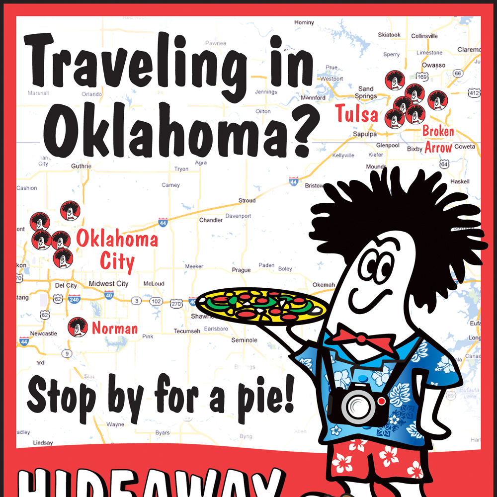I provide a variety of services for Hideaway Pizza as their needs require: menus, advertising, social media memes, web graphics, in-store displays, signage, sandwich boards, billboards, t-shirt designs, cups, mugs, hats, refrigerator magnets, pizza boxes, and more! Here is a sampling of the many projects I work on with Hideaway Pizza.