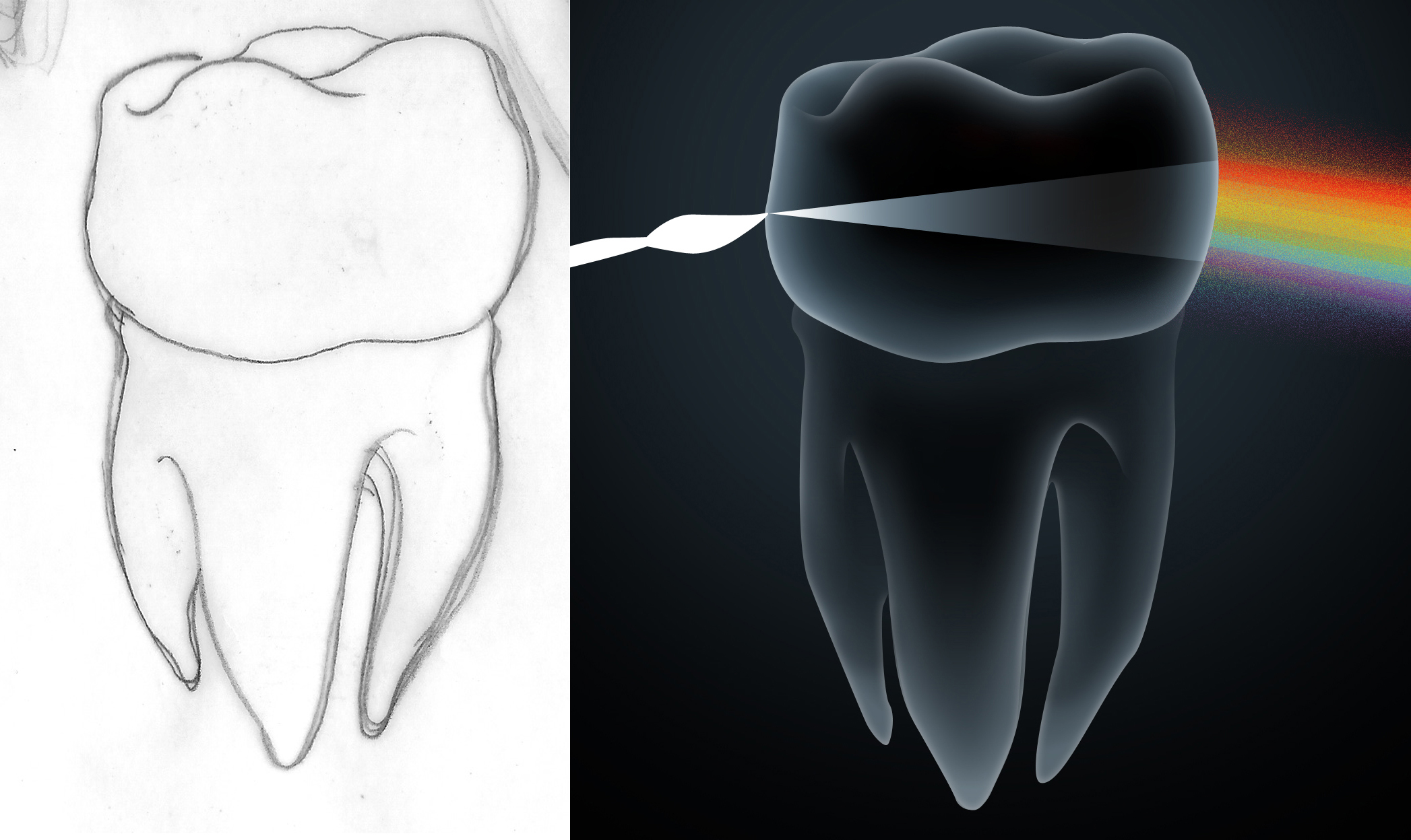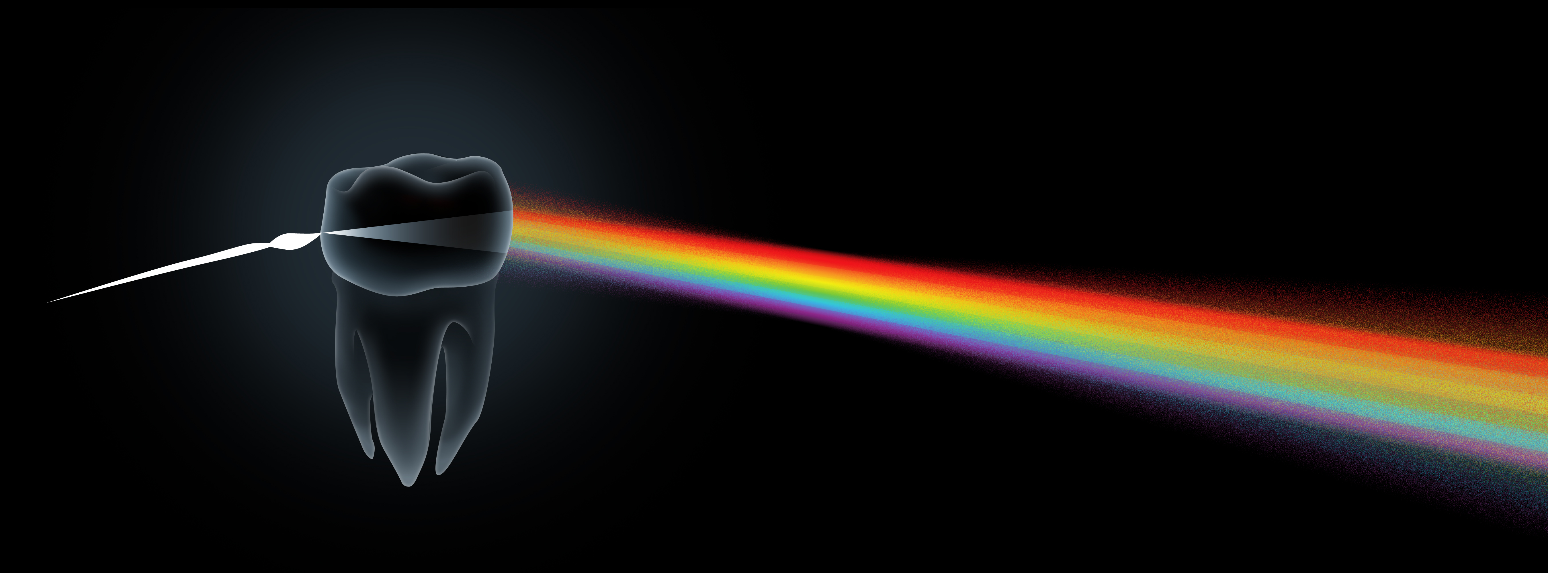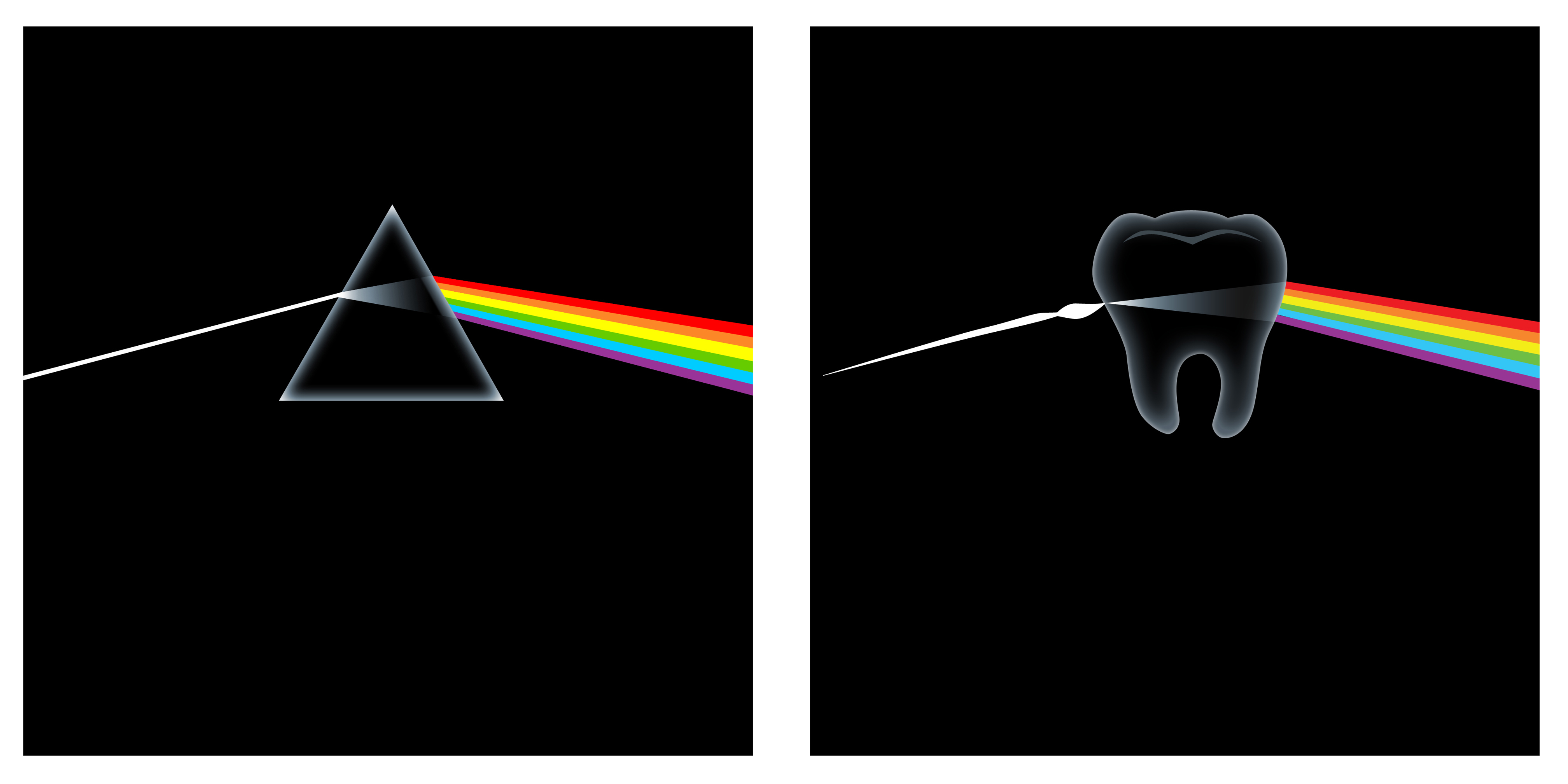Of course, I’m immediately flooded with c-r-a-z-y ideas. For some reason, the Dark Side of the Moon cover, with its spectrum image flashed in my mind. Really ‘dental’ image, right? Turns out, Neil – who is a highly trained master craftsman from South Africa – had the same idea. And that was the impetus for the design.
