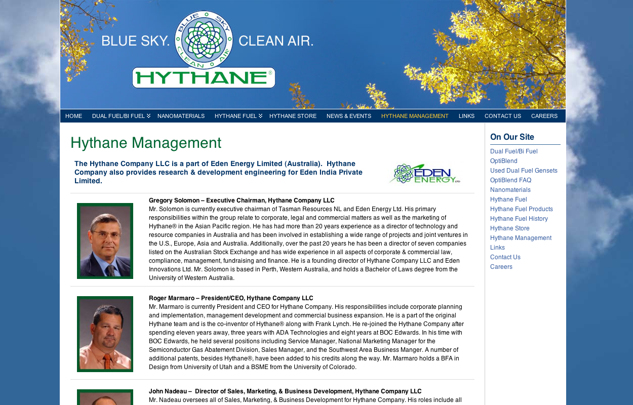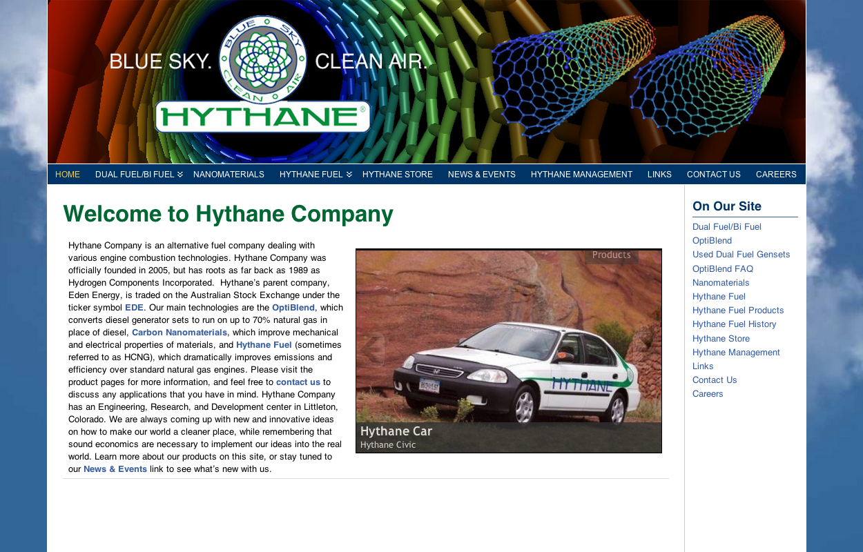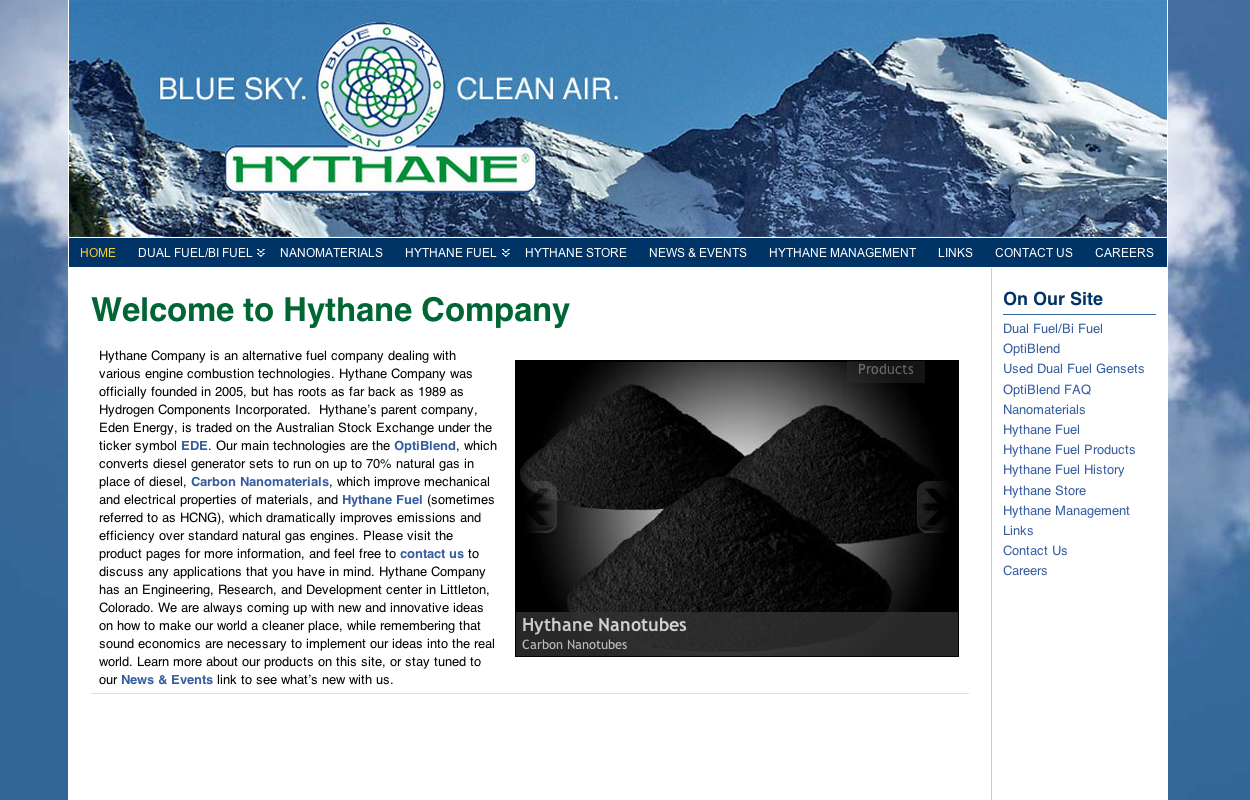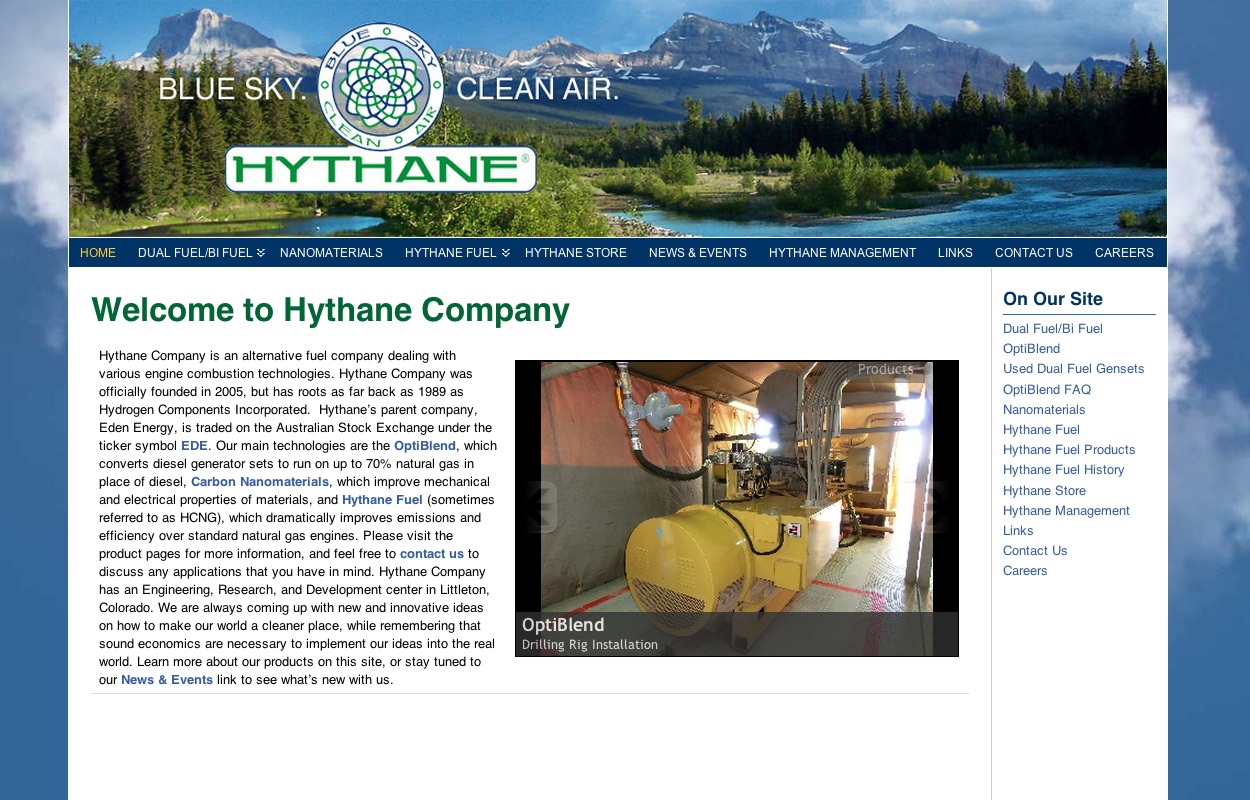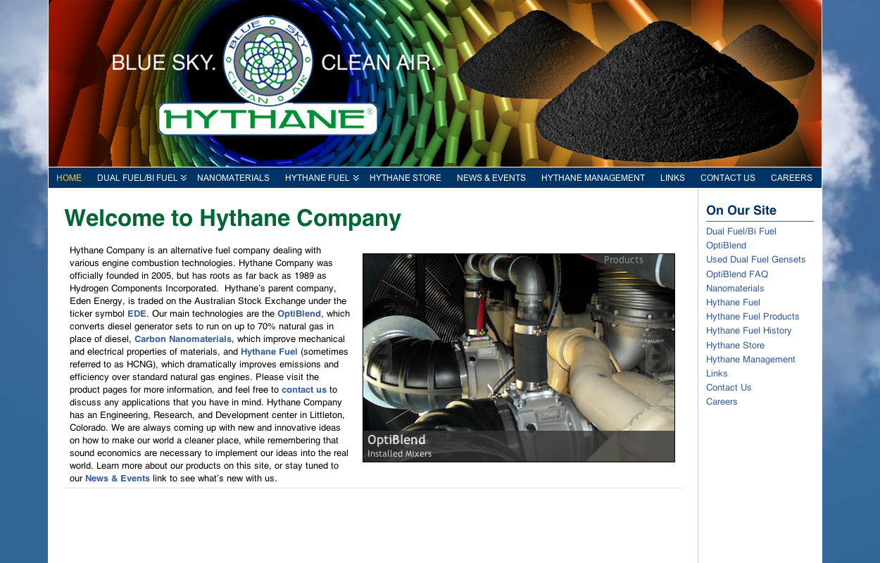 As described on the Hythane Company website, their ” . . . main technologies are the OptiBlend, which converts diesel generator sets to run on up to 70% natural gas in place of diesel, Carbon Nanomaterials, which improve mechanical and electrical properties of materials, and Hythane Fuel (sometimes referred to as HCNG), which dramatically improves emissions and efficiency over standard natural gas engines.”